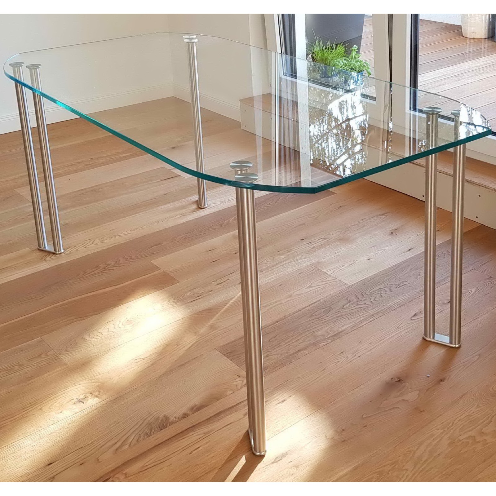 - Glasplatte: 15mm starkes, klares Optiwhite-Glas in Bootsform